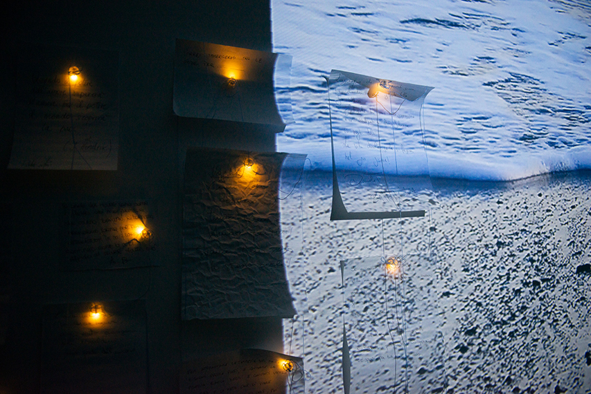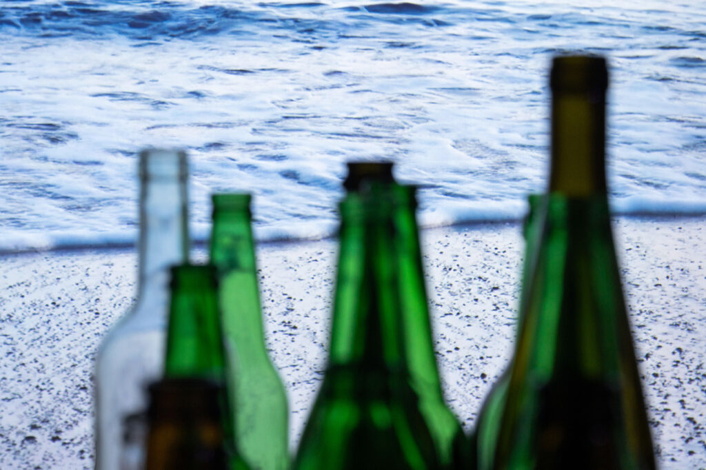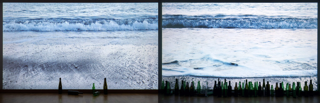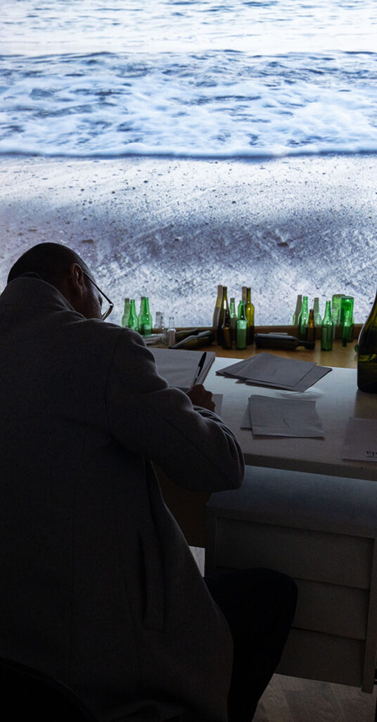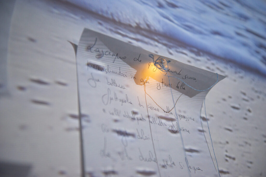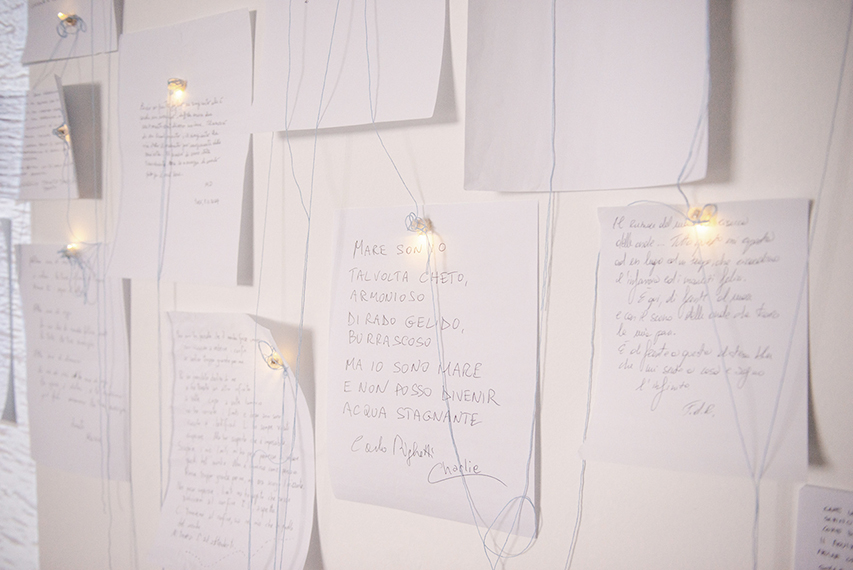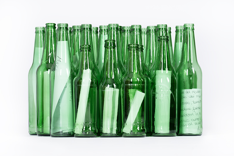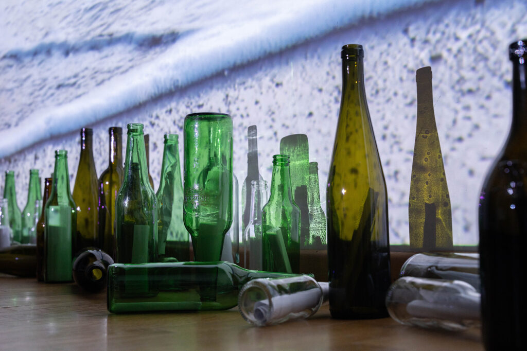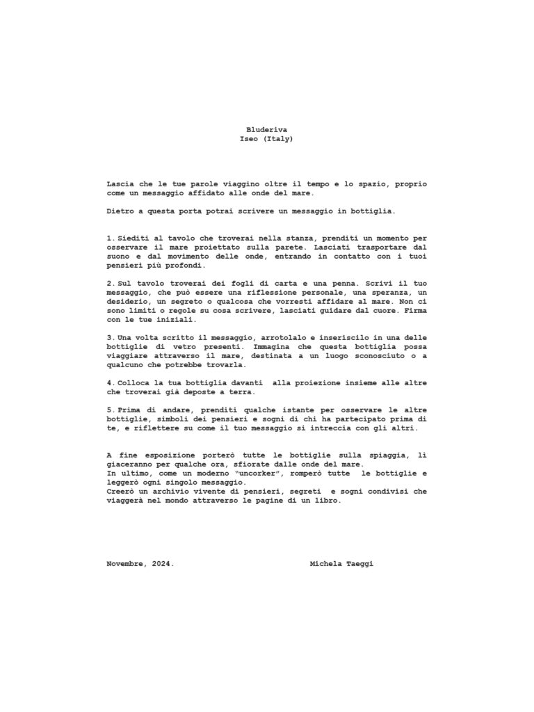 The “Uncorker of Ocean Bottles” was an official figure established by Henry VII, King of England from 1485 to 1509. His job was to examine the bottles that arrived on the British coast, often carrying messages of a military nature. These bottle messages were generally sent by spies or sailors in distress, containing vital information about the movements of enemy fleets, warnings of imminent attacks, or distress calls. The interpretation and management of such messages were fundamental to the military strategy of the time. This role has left a lasting legacy in the history of maritime communication and remains a symbol of the power of words and messages, even when entrusted to the waves of the sea. “Bluderiva” is a participatory art project that invites visitors to immerse themselves in a collective reflection through the symbolic power of the sea and the intimate gesture of writing. In an exhibition space wrapped in a large video projection of a moving sea, participants were invited to write their own “message in a bottle”; a thought, a hope, a never confessed secret or a personal wish. Bottles, day after day, have increasingly invaded the exhibition space. The work evolves continuously thanks to the contribution of the public, becoming a map of emotions, thoughts and collective dreams, navigating between the intimate and the universal. This project intends to explore the human need to communicate beyond one’s own space and time, emphasizing the deep bond between the individual and the world around him.